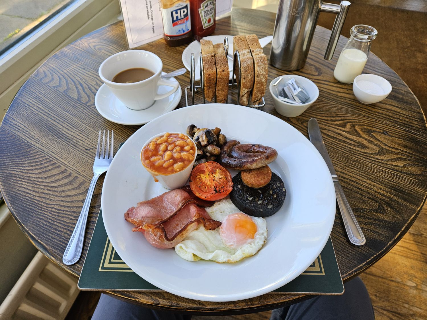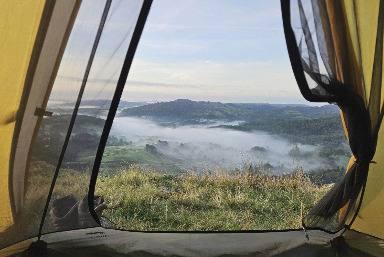 I had a good wander around to take some photos and I’m now having my morning coffee. I’ve no rush at the moment, so I can let the tent dry out a little. Sitting here sipping coffee and looking at the view through my tent is sheer bliss. It’s nice to watch the inversion retreat as the early rising sun warms the valley below. I don’t want to leave, but I have a full English breakfast waiting for me in the village a short distance away. There’s no better incentive than that!