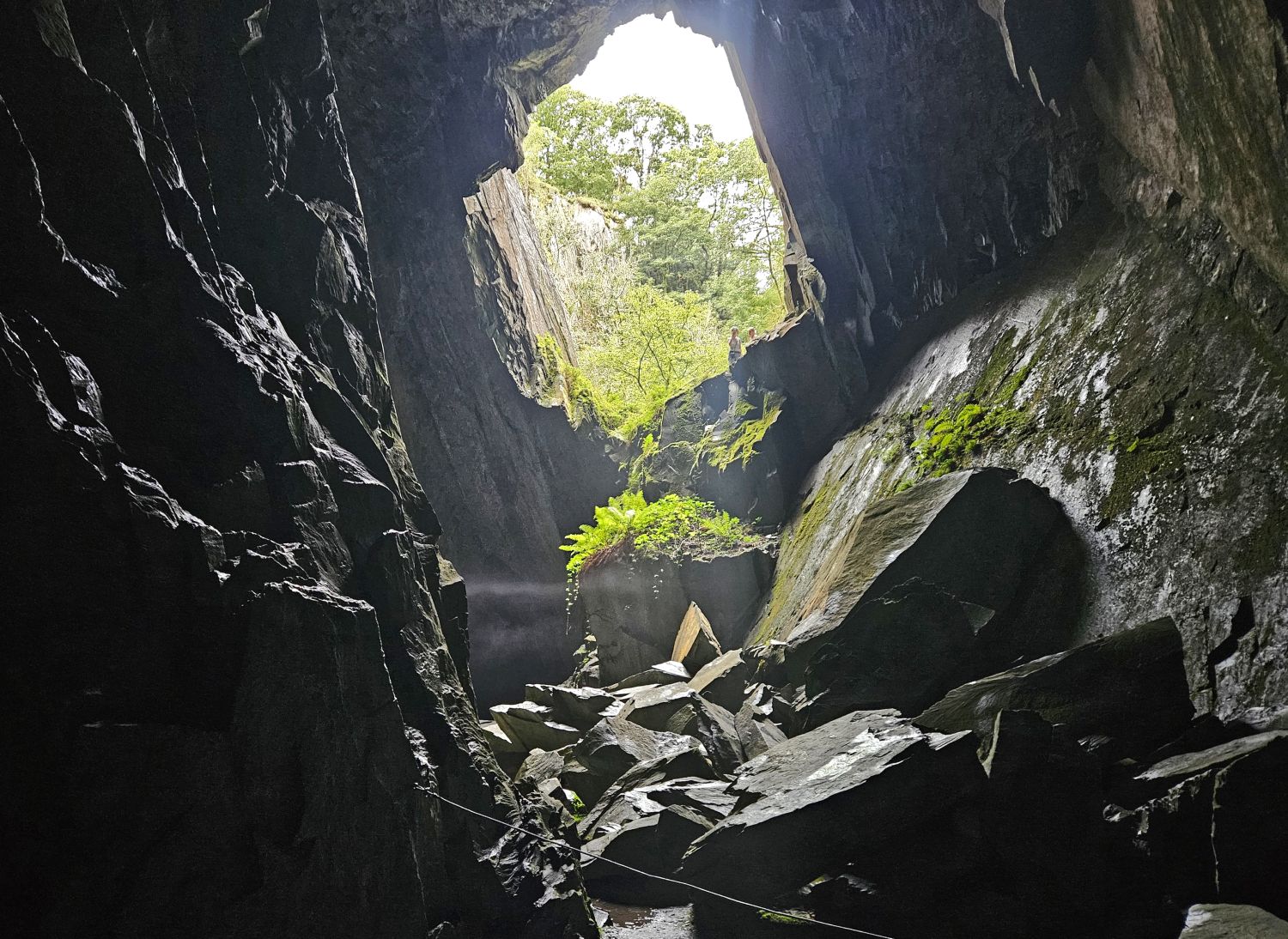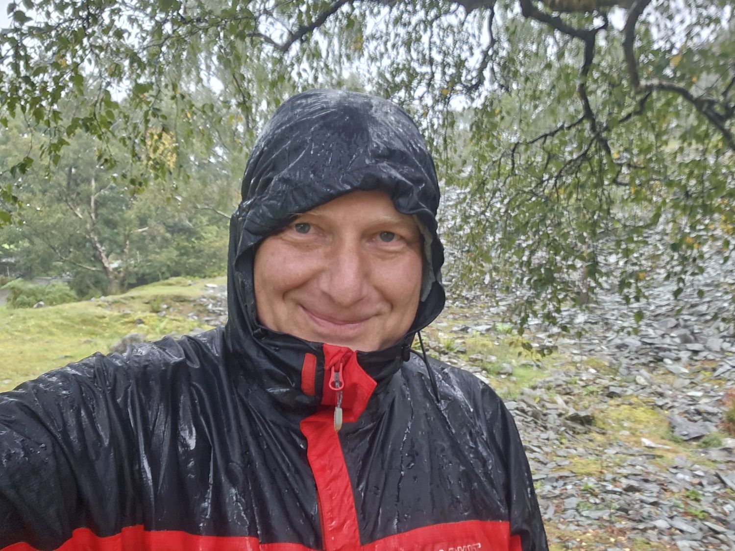 As predicted, I got caught up in the thunderstorms. Just after leaving Cathedral Cave in Little Langdale, the lightning started above me, and then came the heavy stuff. Here I am, totally drenched at Hodge Close. I’m loving it though; it’s actually a nice change from the heat and the sun, and also being able to just concentrate on the ground underfoot and simply crack on.