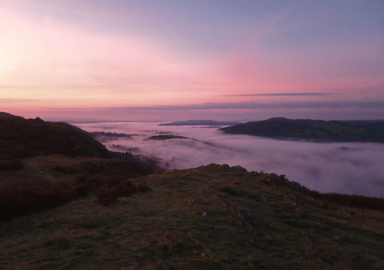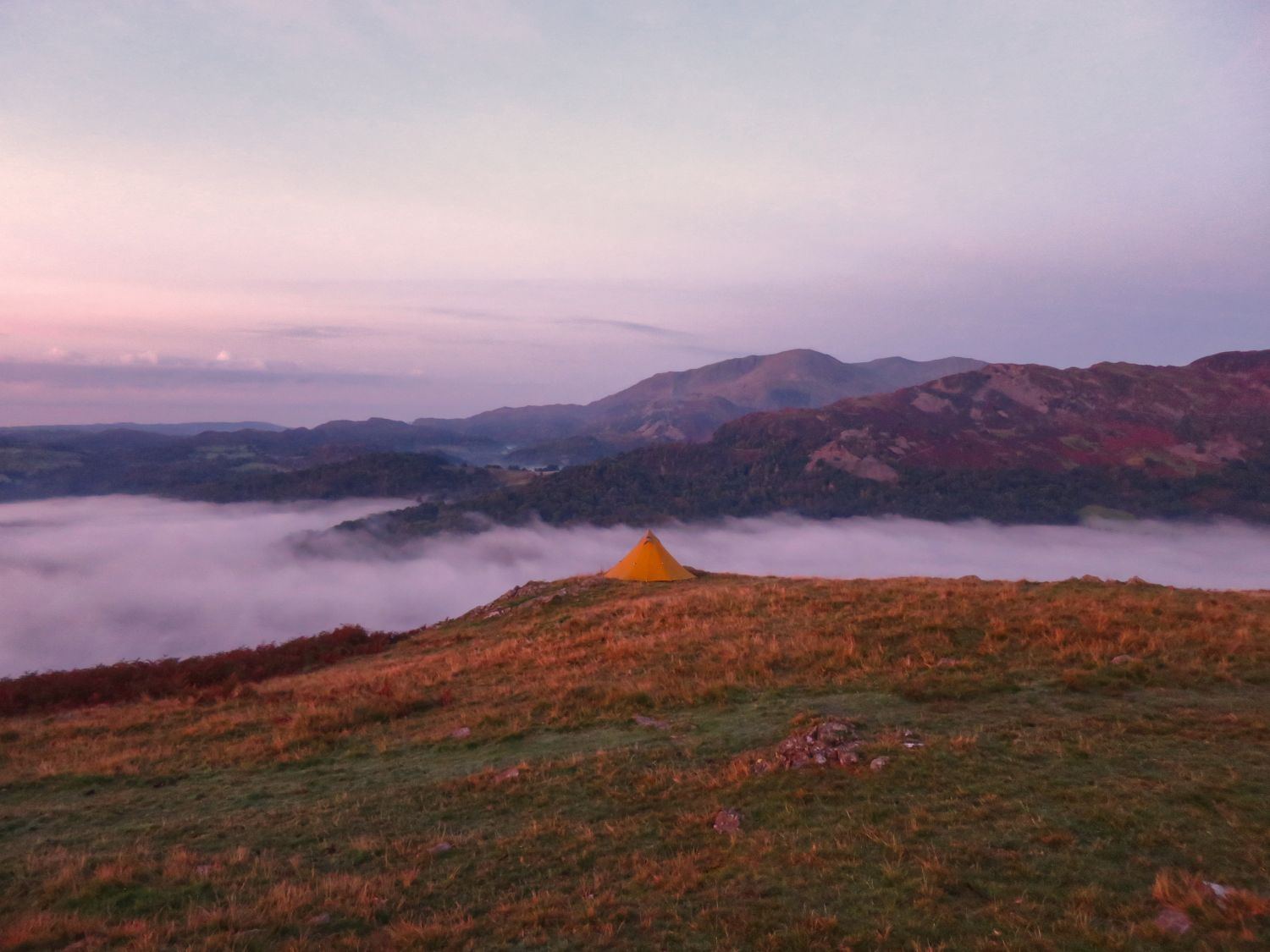 Morning, and look how wonderful this is! I woke at 6am and peeked out of the tent to witness a fantastic inversion in the valley below. It is now sunrise, and there’s a wonderful red glow on the horizon, with stillness in the air.