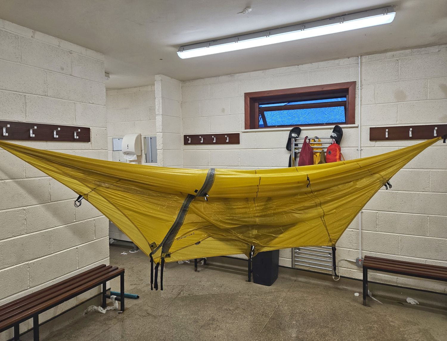 I’m now on a mission. I need to dry the fly of my tent as much as possible, so in desperation I’ve hung it in the showers of the social club. The showers and toilets hadn’t yet been cleaned from the day before — note the paper towels, including one on the ceiling! — so I’m thinking I will get away with this before the cleaner arrives. In fact, I will give it a good mop before I go. The single radiators — one in the men’s and one in the women’s — had provided a good opportunity to dry all my other gear through the night, including my jacket, fleece, socks, etc. All that is left on the radiators this morning are my flip-flops and a few dry-bags.