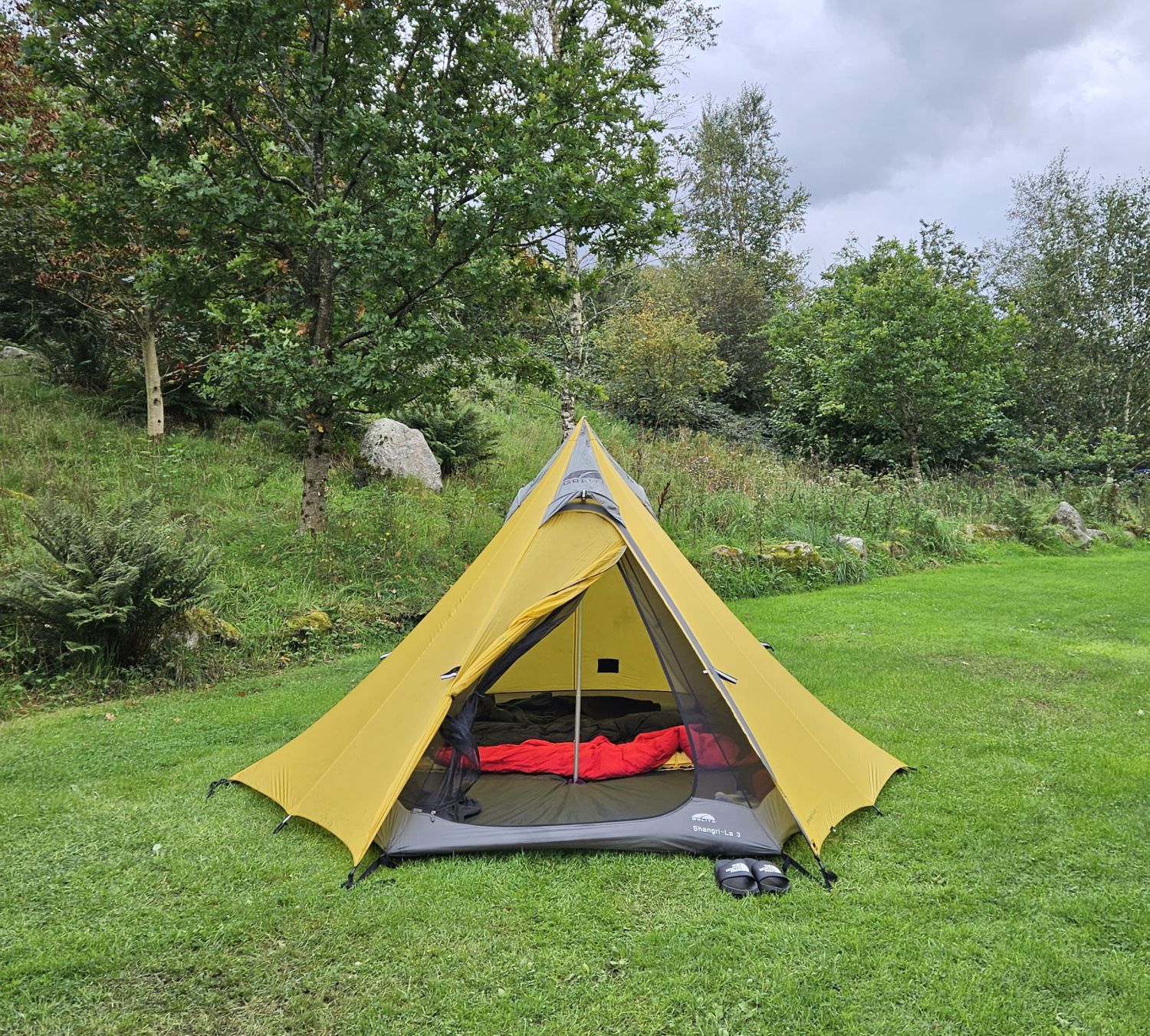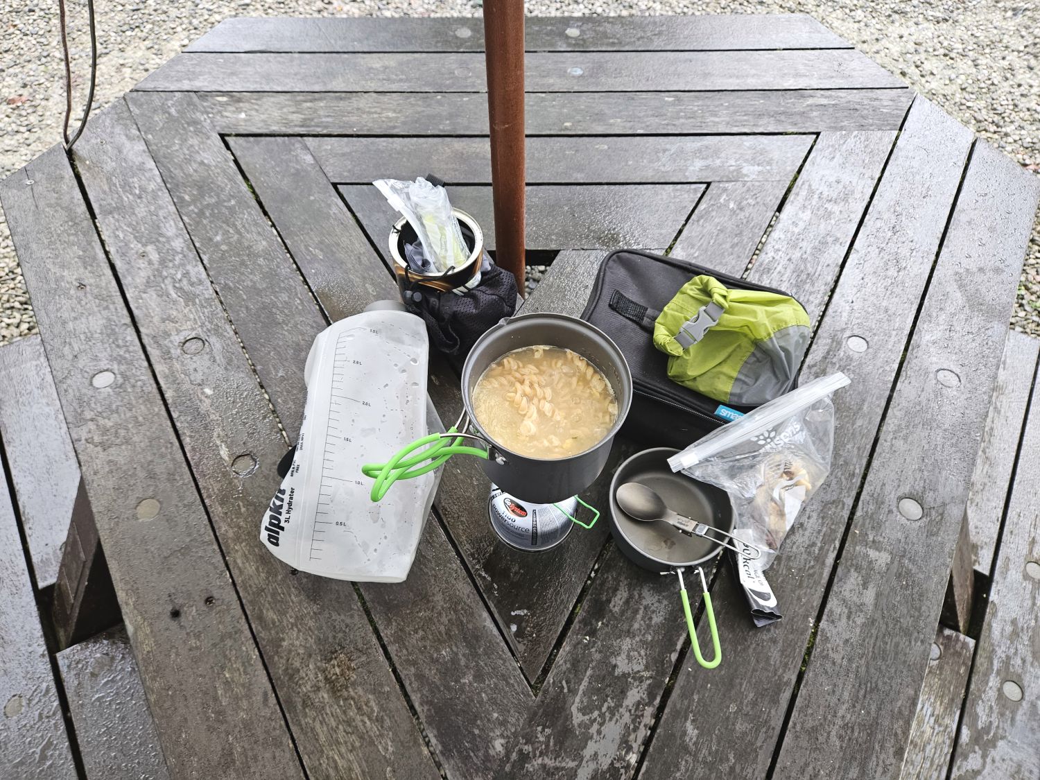 The rain continued for the next few hours, and with the thought of it getting even heavier, I needed to get the tent pitched. This was tricky because my tent system is ‘inner first’, so the inside will get wet. Thanks to my new friend behind the bar, who provided me with more towels, I was able to dry the inside of the inner before sorting my gear out.