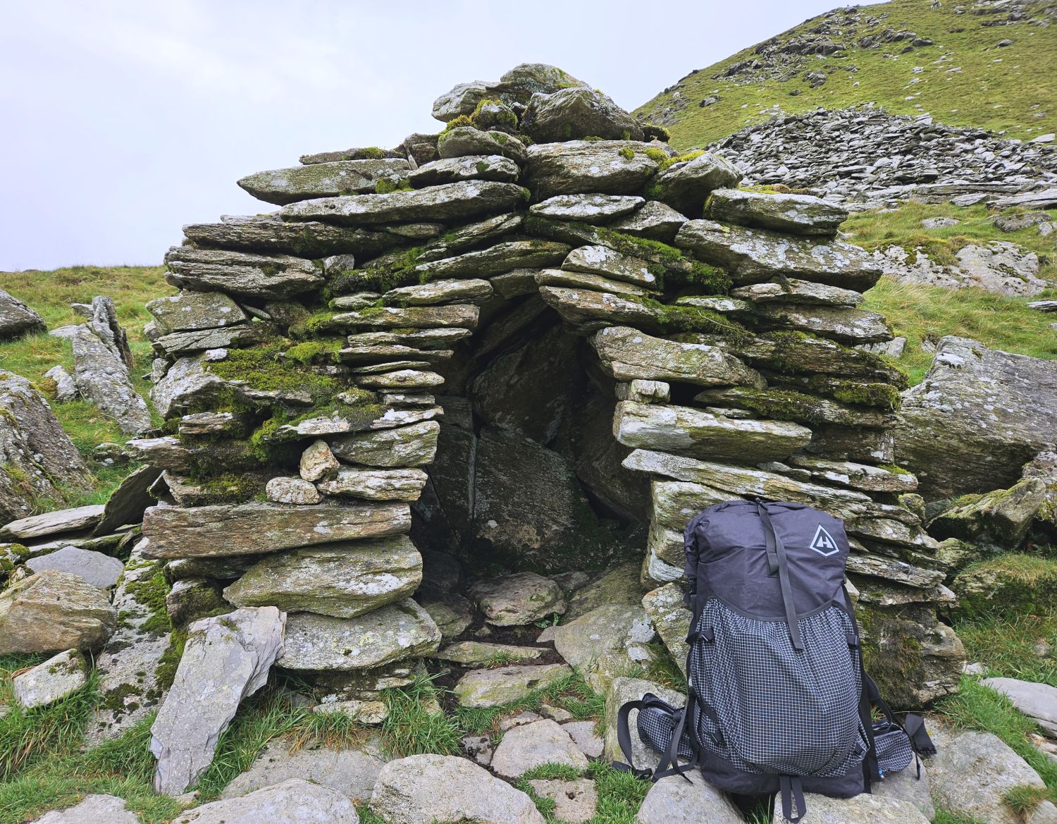 I’ve now reached the base of Stanley Ghyll, a deep ravine of footbridges, waterfalls, and fallen rocks. There are many people about now, which is a change from the isolation of yesterday’s walk from Seathwaite in the Duddon Valley. I’m enjoying saying hello to so many walkers, though I do stand out a little among the trainer-clad dog walkers — it’s not likely that many multi-day hikers head up this ravine and beyond.