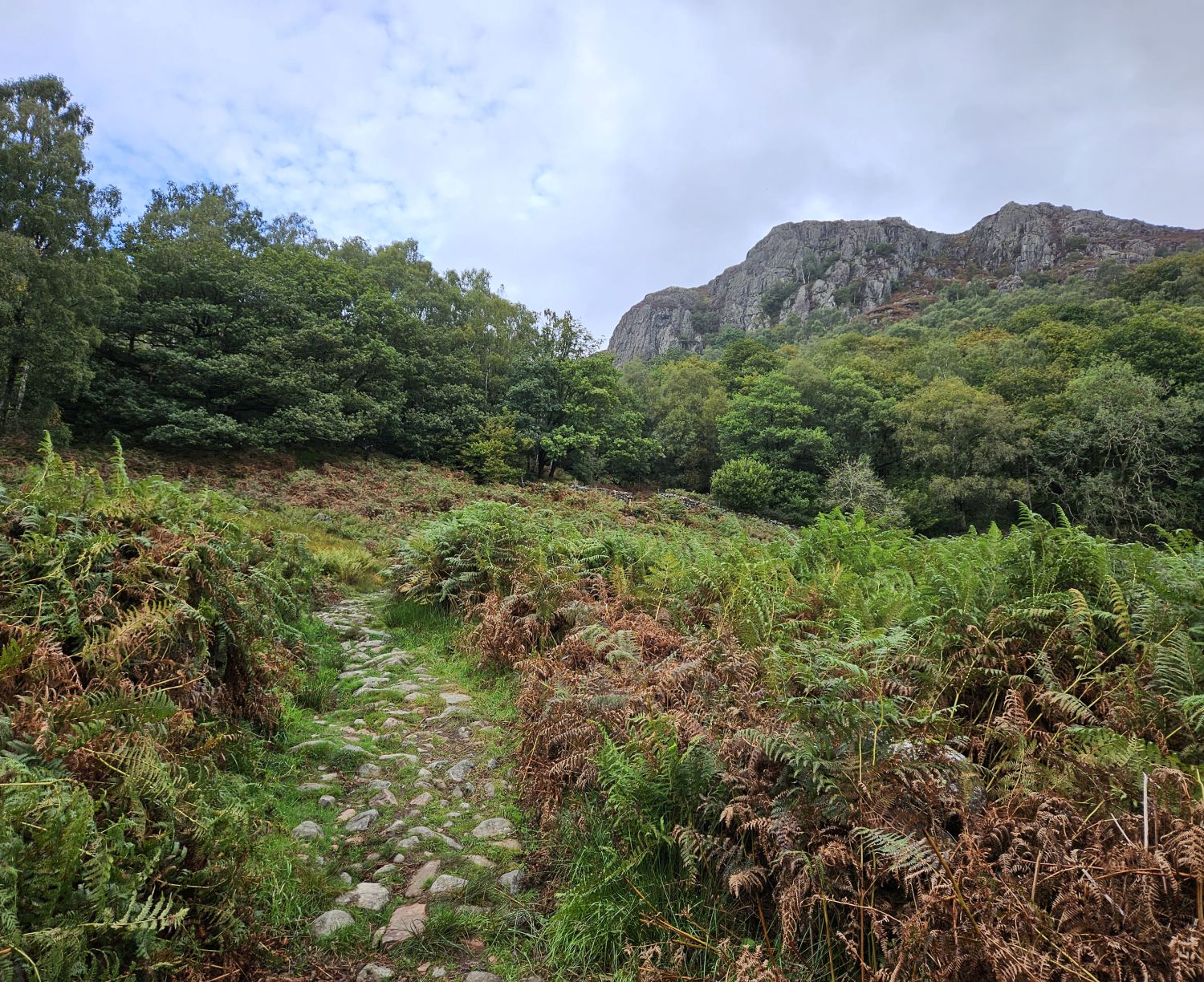 Wallowbarrow Crag is seen ahead, towering above the wooded slopes, as I ascend The Rake from High Wallowbarrow Farm. The stepping stones over the River Duddon were easy enough to negotiate, as there’s been very little rain recently.