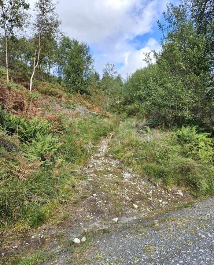 I’ve arrived at the start of my next ascent, the narrow track that climbs through the forest all the way to Hardknott Pass. This junction is very easily missed when walking along the forest road. The track is an old bridleway and, due to very few people walking this way, it can become overgrown at times. Hopefully, now that Lakeland Wayers are travelling this way, it will get more use.