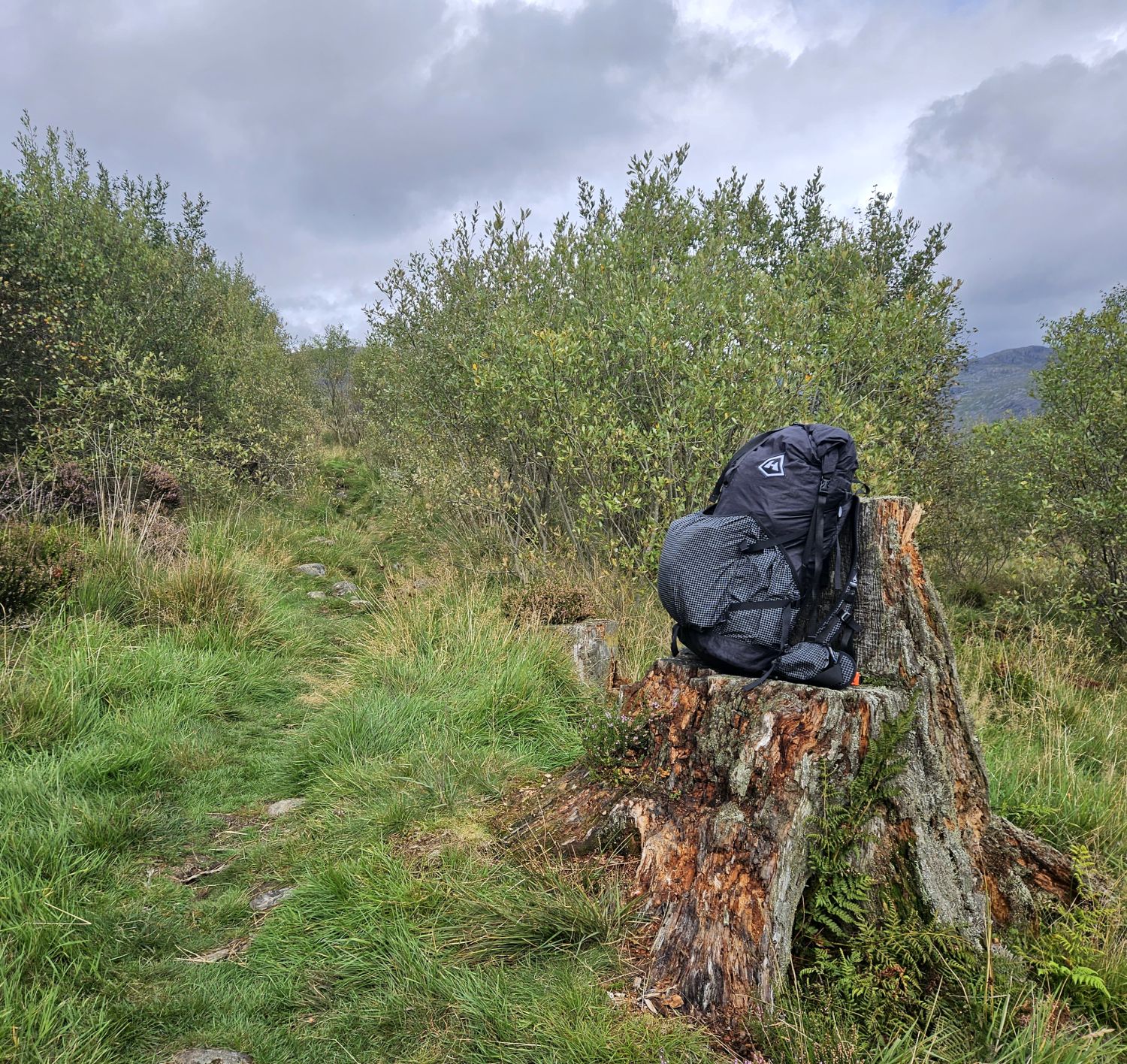 It’s time for a rest after that climb through the dense forest. The area has become more open now, and this tree stump provides a good seat for my rucksack.