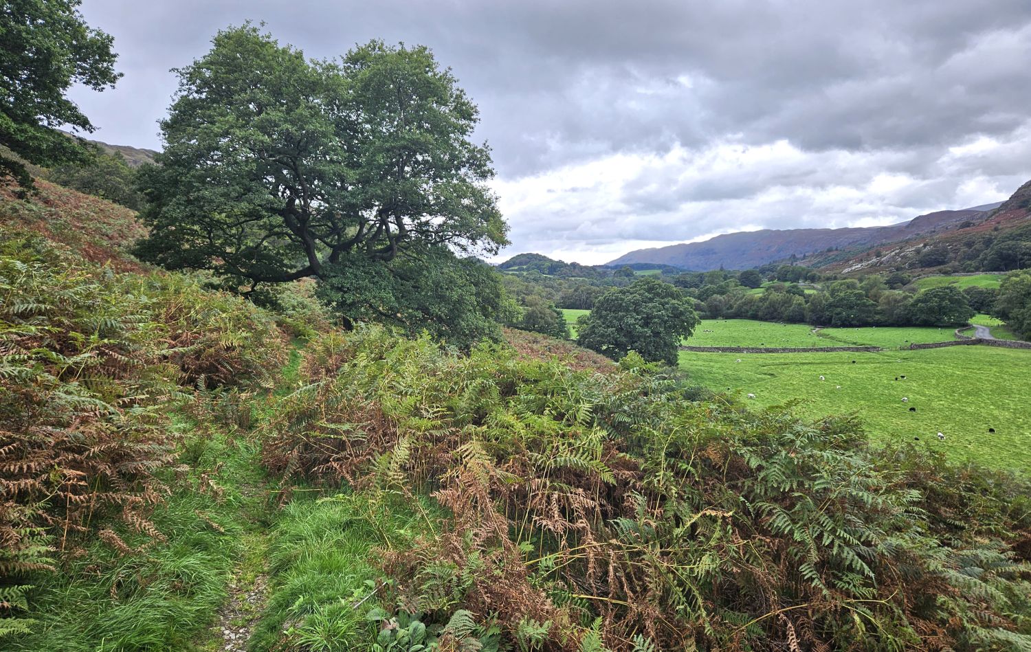 I’m now starting my descent from Dow Bank to the village of Chapel Stile, which you can see in the photo down on the right. This is a very steep drop from the col, so it’s best to take my time, especially with having this heavy pack. Look at those clouds building up though — today thunderstorms are predicted, so I’ve got my waterproofs handy at the top of my pack.