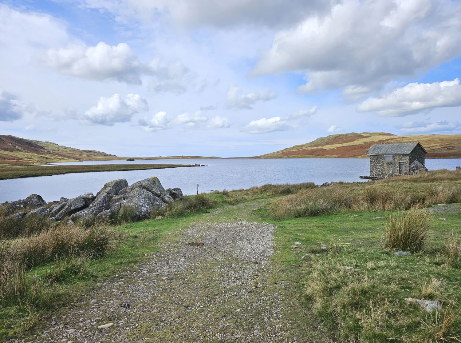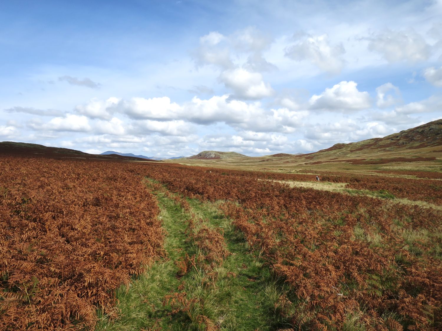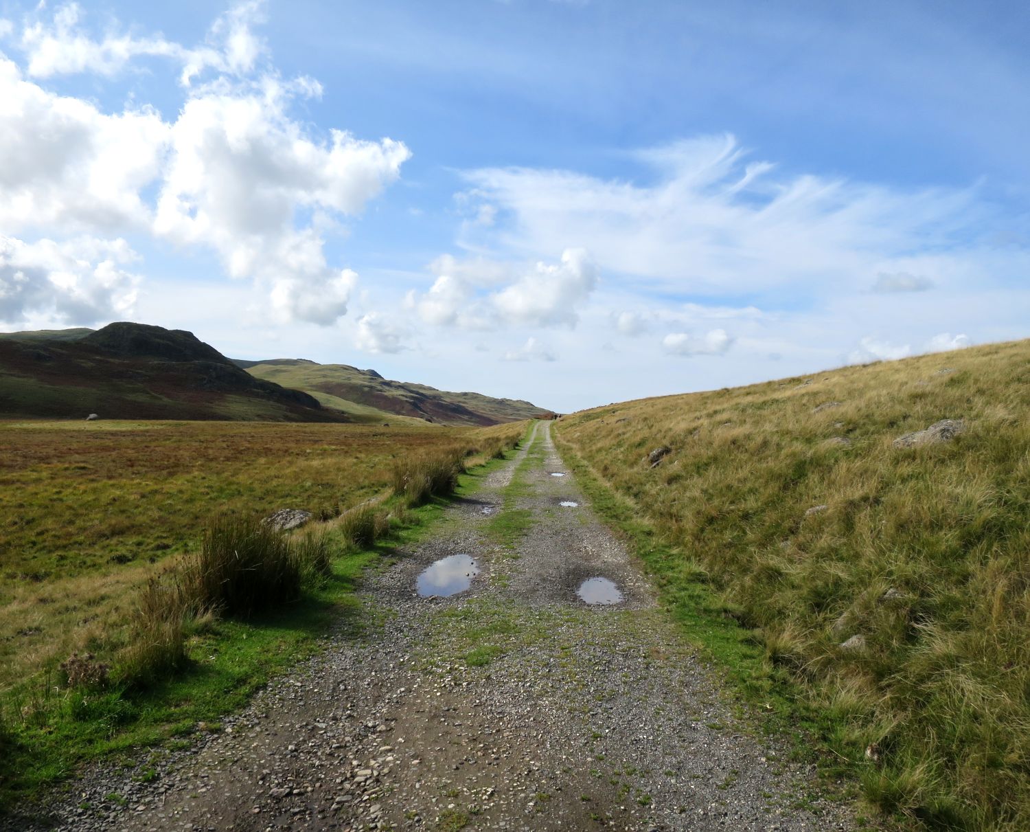 Having passed through farmland, I’m now returning to fells, moorland, and tarns. This is the long, straight track to Devoke Water.
