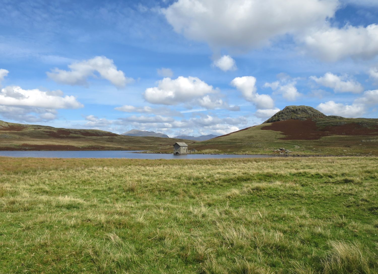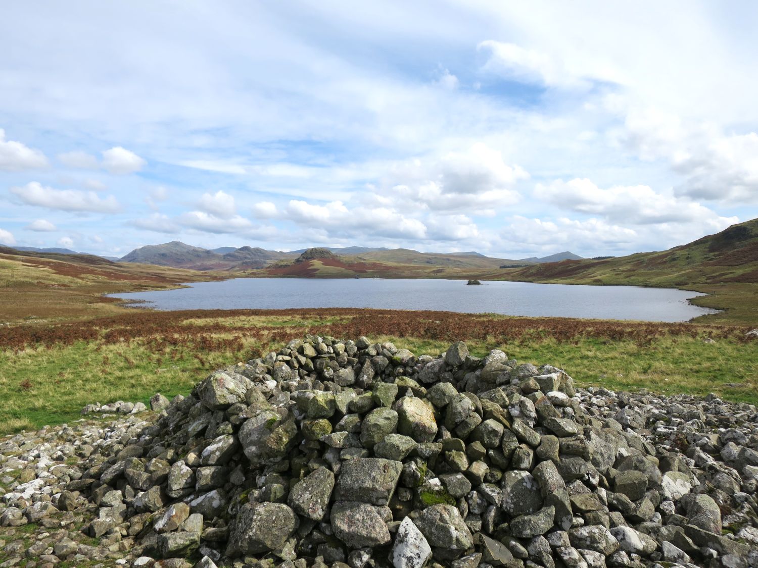 I’ve now arrived at the large cairn just beyond the foot of Devoke Water, which offers a fine view of the fells to the east and the land leading to the sea in the west. The cairn was originally a burial mound of stone, though it now serves as a shelter.